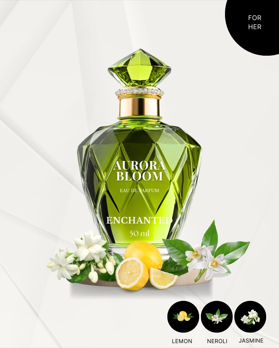 “Aurora Bloom” brings a burst of freshness to your morning with sparkling lemon, elegant neroli, and radiant jasmine. A sunshine-in-a-bottle fragrance for vibrant and confident starts.
